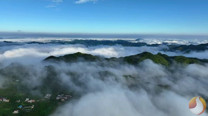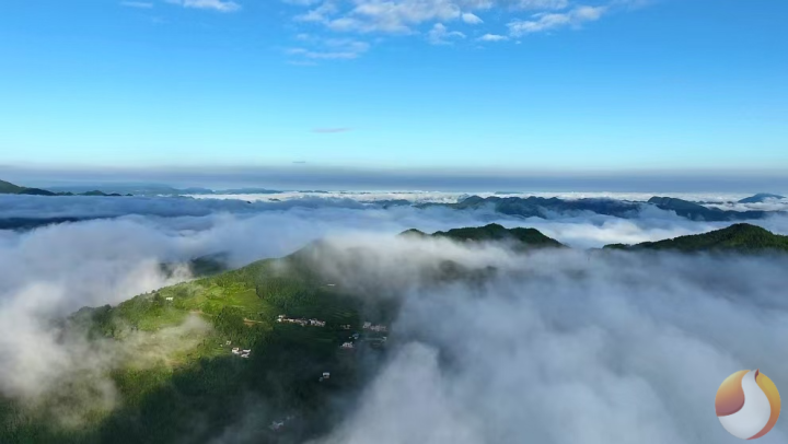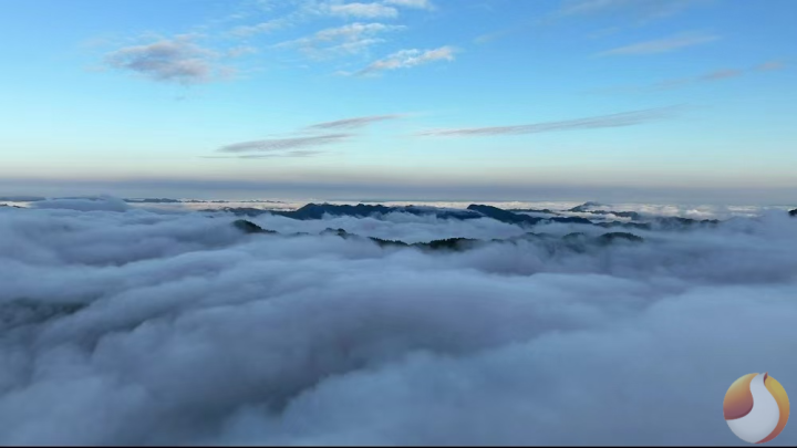从空中俯瞰,连绵起伏的山峦之间映入眼帘的是绝美的云海景观,蜿蜒的山间道路、风叶在云雾中若隐若现,置身其中,如同仙境一般。在阵阵山风吹拂下,云海不断变幻,时而奔涌如潮,时而连绵起伏,尽显大自然的神奇。蓝天、云海、群山浑然一体,犹如一幅秀美的山水画卷,让人沉醉。