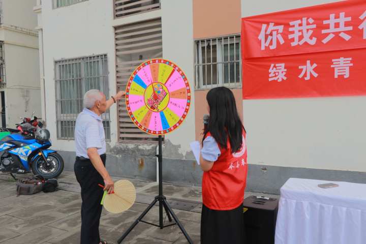 “环保知识转转乐”趣味游戏吸引了众多居民踊跃参与。转盘上写有全国生态日设立时间、节水节电小窍门等环保知识,帮助居民在互动中实现对生态文明理念从知晓到理解、再到认同的过程。