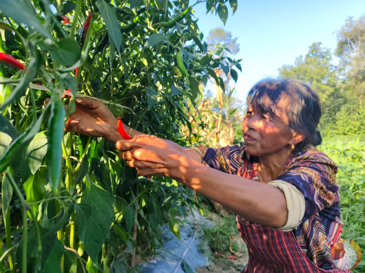 明堂村村民江祖念说:“我在这里摘辣椒,一天能挣七八十元,离家又近。”