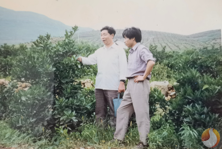 1995年,丁永向(右)在脐橙果园了解果树生长情况。(受访者供图)