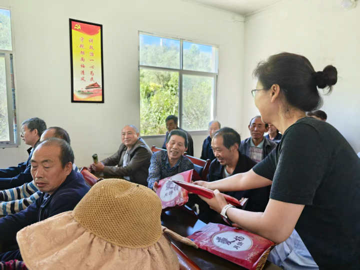 宣讲会后,活动转入温馨祥和的中秋慰问环节。志愿者们与村民齐聚一堂,亲切交谈,听民声解民意并向他们送上节日慰问。一盒盒象征着团圆和美的月饼送到群众手中,传递着党和政府的深切关怀。“感谢你们经常挂念我们,逢年过节都来看望我。”特困老人彭泽金激动地说。