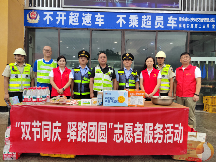 三大队在奉节服务区开展“双节同庆 驿路团圆”志愿服务活动。(市交通运输综合行政执法总队供图