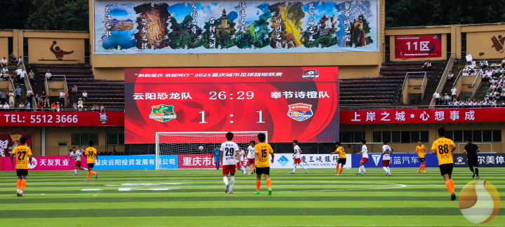 10月12日下午,“新韵重庆 渝超同行”2025重庆城市足球超级联赛渝东北三峡库区云阳主场比赛在云阳县龙脊岭足球场完美收官。主队云阳恐龙队坐镇主场,与远道而来的奉节诗橙队展开激烈角逐,最终双方以1:1的比分握手言和。