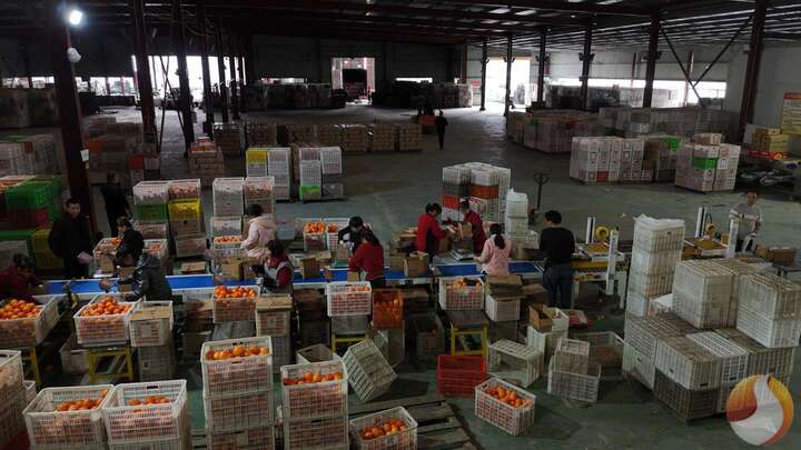 这些新鲜采摘的脐橙会被迅速运往加工车间,工人们按标准分拣、打包、称重、装车,全程规范作业,确保果品质量。打包工人吴丽蓉介绍,复工以来订单明显增多,大家从早上八点忙到下午六点,最多一天能打包六七千箱。